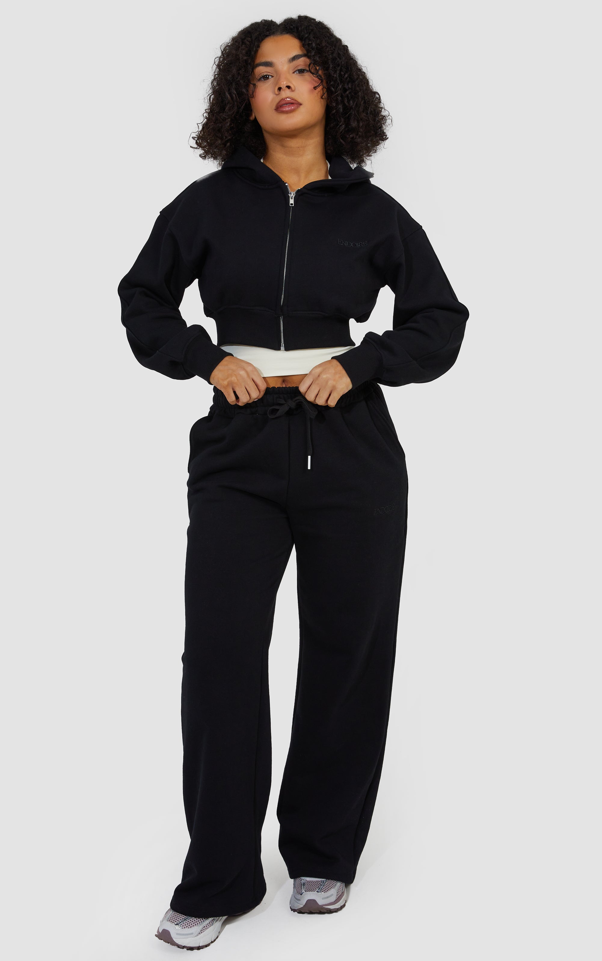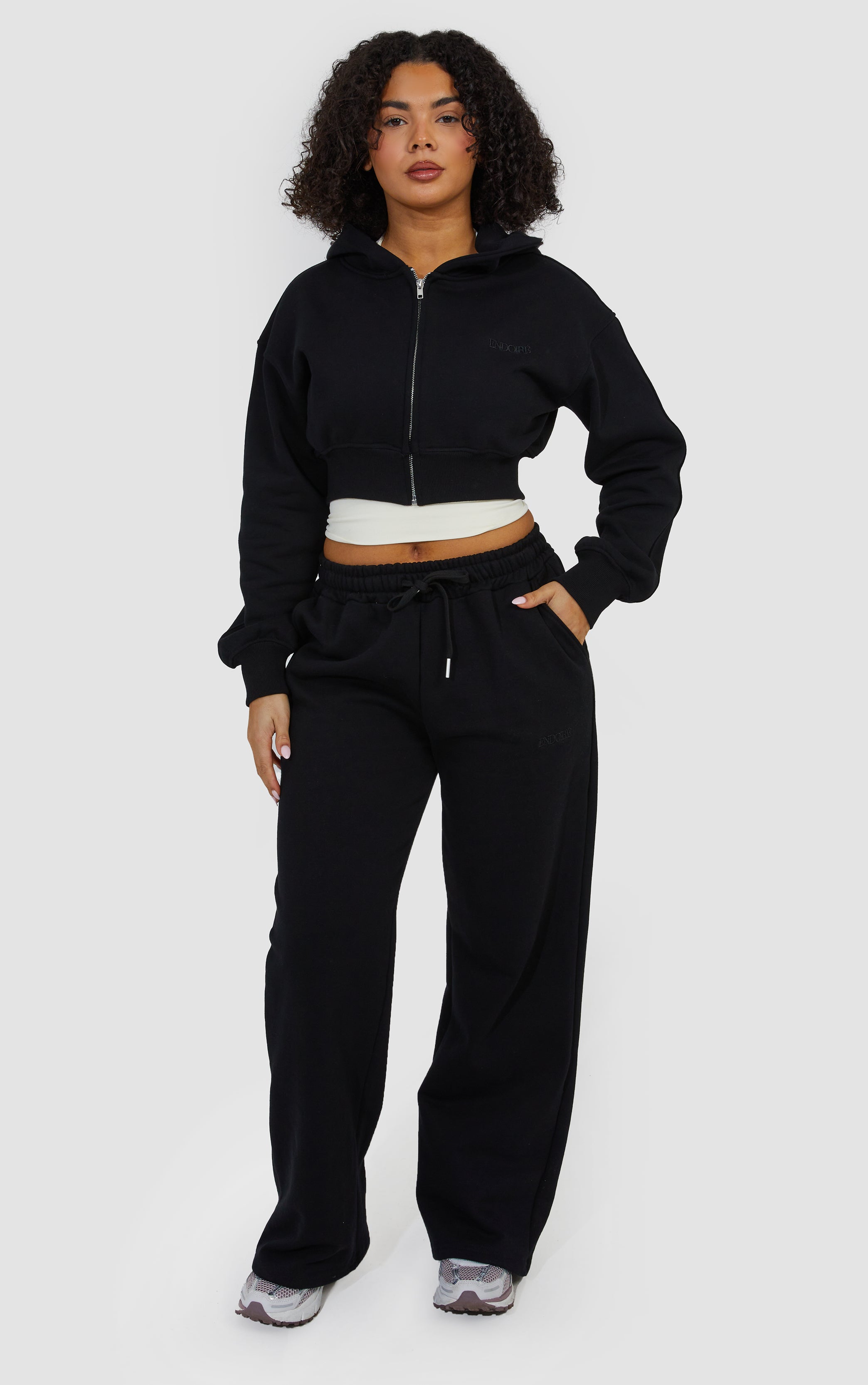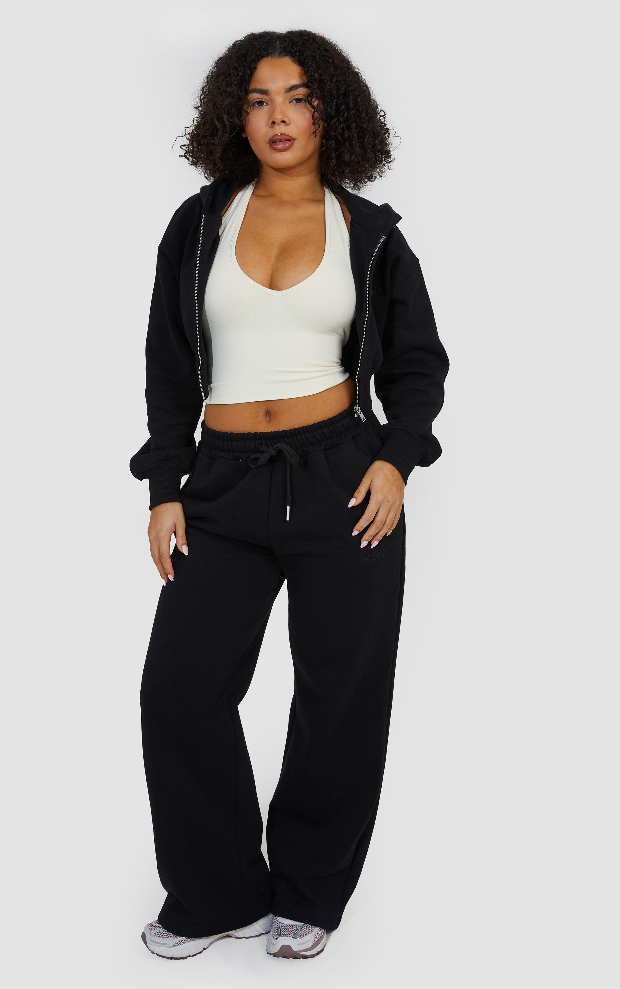 Layered Wide Leg Jogger and Zip Through Cropped Hoodie - Black